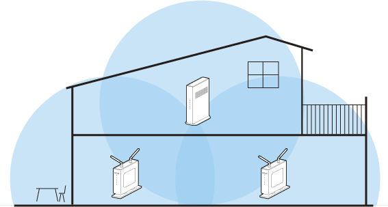 メッシュWi-Fi®とは、1台のメインルータ(メッシュ親機)と1台以上のサテライトルータ(メッシュ中継機)それぞれから広がる電波により、隈なくエリアをカバーするためのWi-Fi®の拡張機能です。