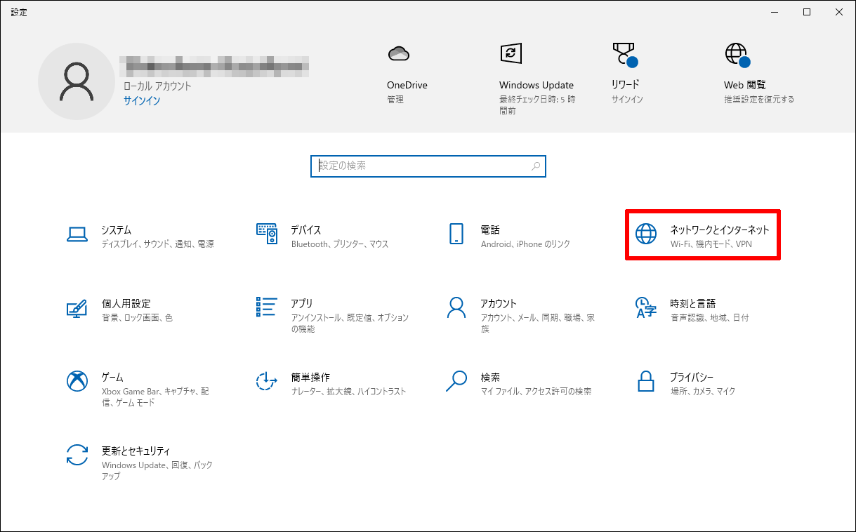 パソコンの「スタート」メニューから「設定」を選択し、「ネットワークとインターネット」をクリックする
