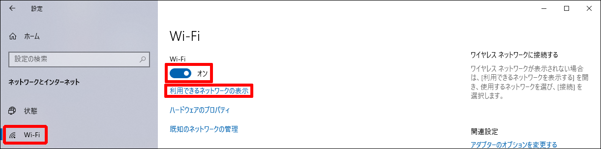 「Wi-Fi」を選択し、「Wi-Fi」を「オン」にして「利用できるネットワークの表示」をクリックする