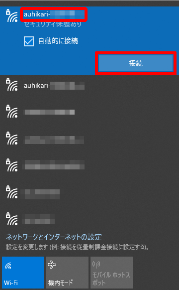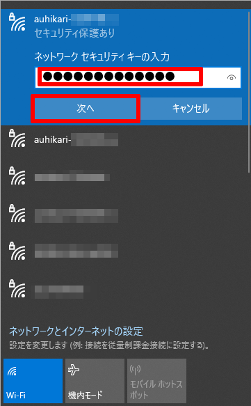 暗号化キー(パスワード)を「ネットワークセキュリティキーの入力」欄に入力し、「次へ」をクリックする