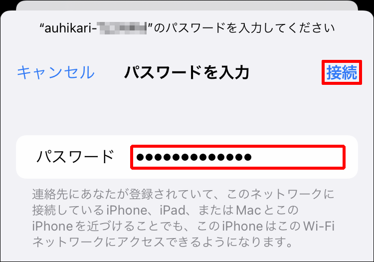 暗号化キー(パスワード)を「パスワード」欄に入力し、「接続」をタップする