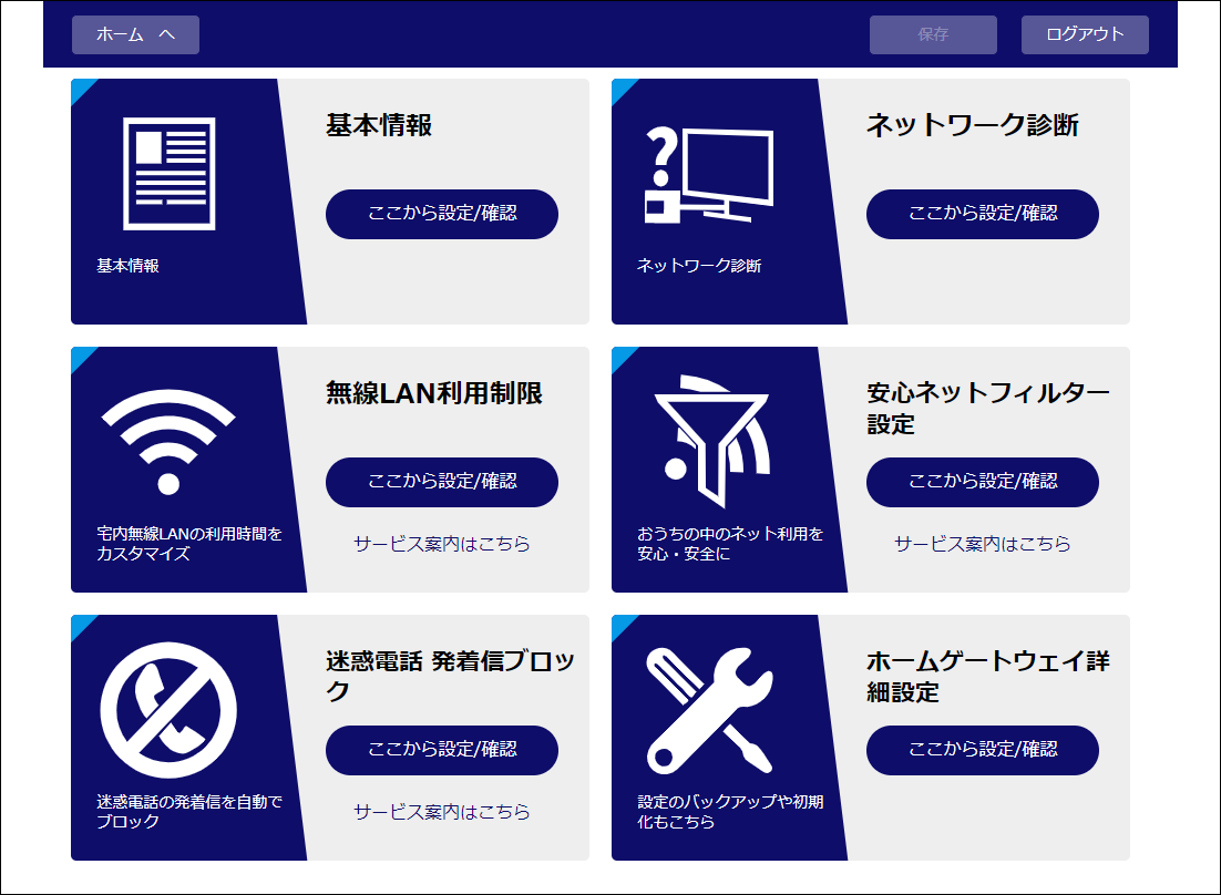 詳しい操作方法については、この機能詳細ガイドの画面左のメニュー「設定を行う」→「ホームゲートウェイ詳細設定」から必要な項目を選んで参照してください。