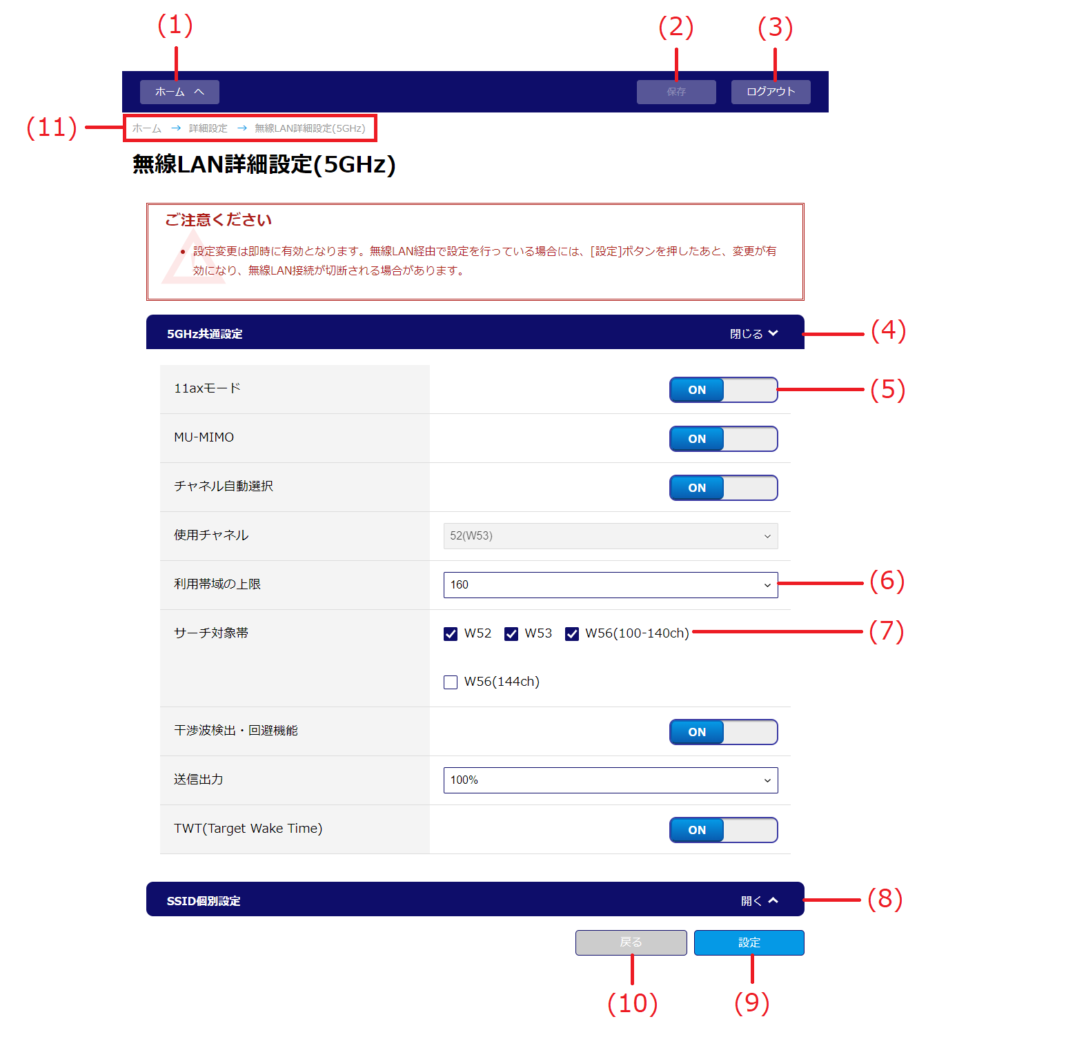 例:「無線LAN詳細設定(5GHz)」画面