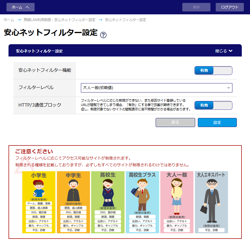 「有効」に設定した場合、フィルターレベルに応じてアクセス可能なサイトを制限しますが、必ずしもすべてのサイトが制限されるわけではありません。