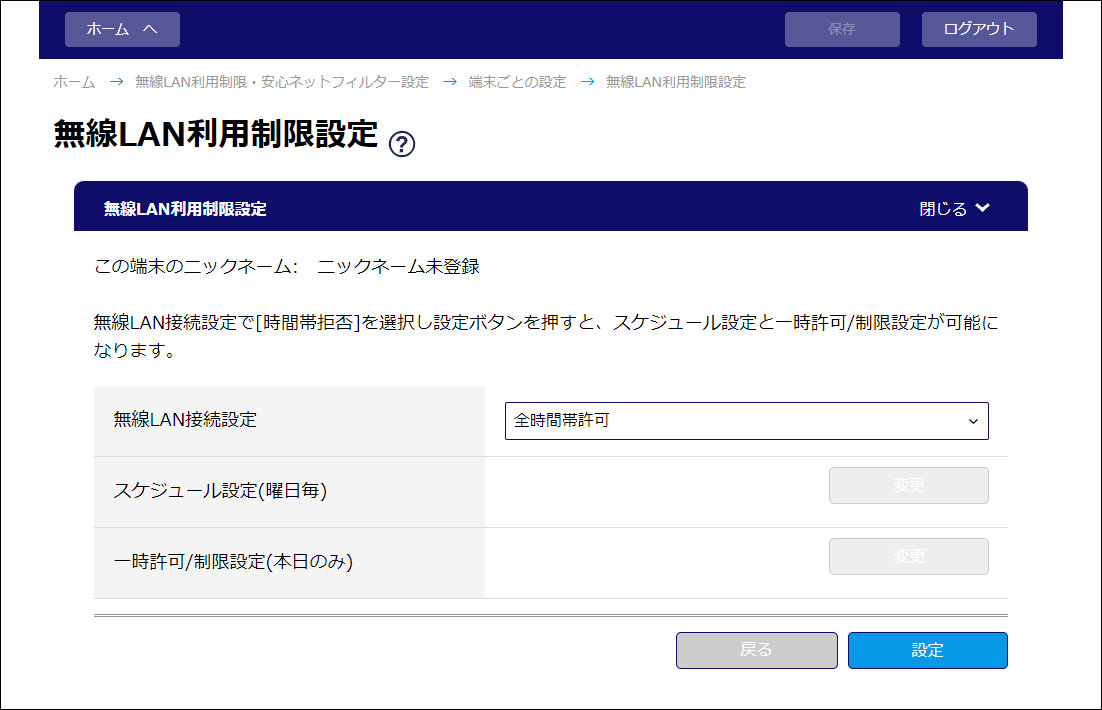 「スケジュール設定(曜日毎)」や「一時許可/制限設定(本日のみ)」の項目を変更するには、「時間帯拒否」を選択してから「設定」をクリックしてください。