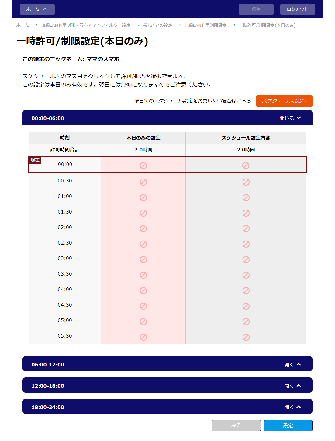 「一時許可/制限設定(本日のみ)」の「変更」をクリックする