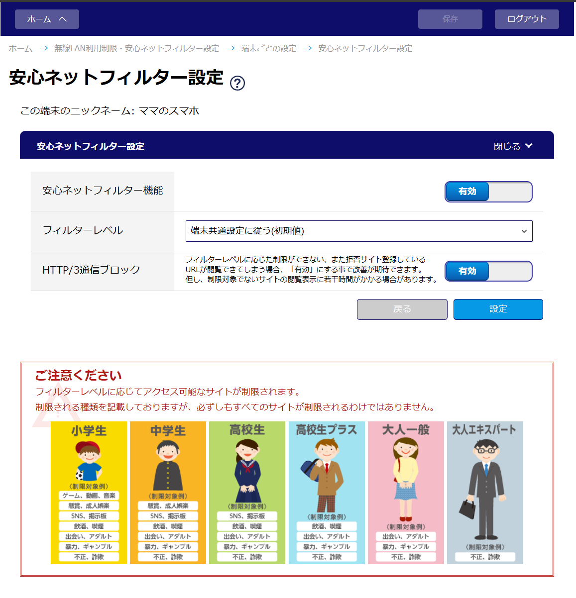パソコンやスマートフォンなど、端末ごとにフィルターレベルを設定します。