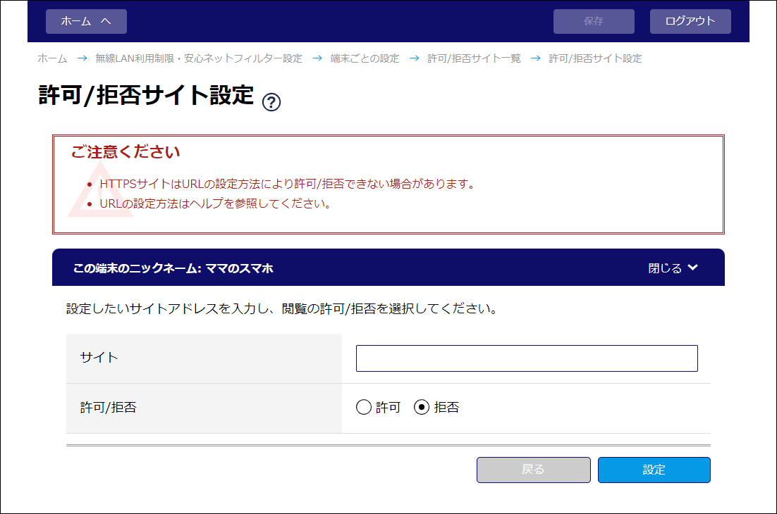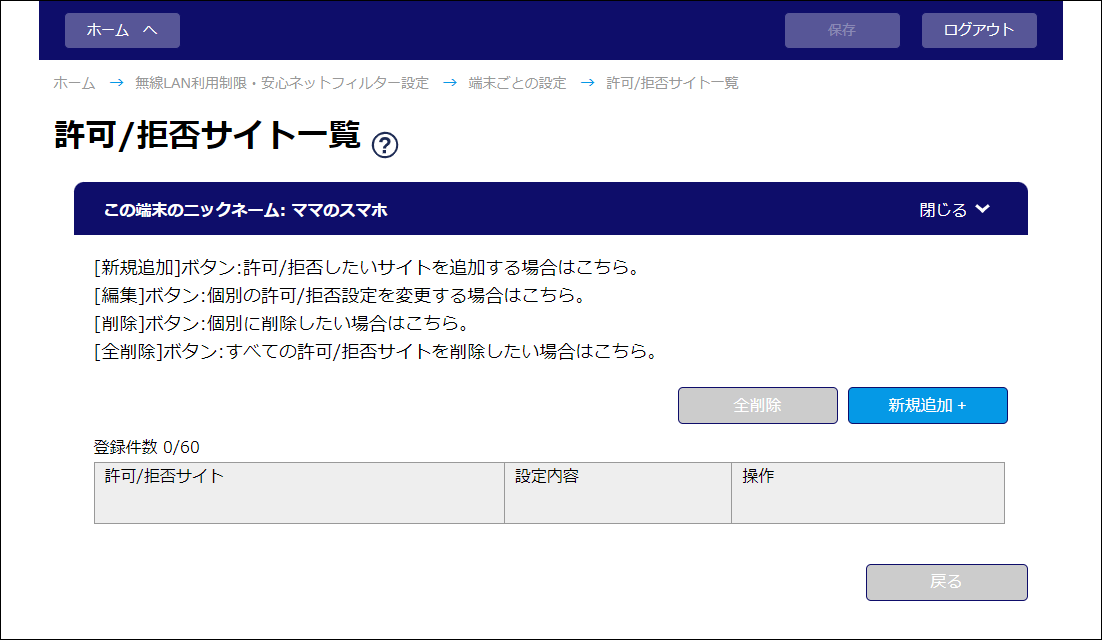 パソコンやスマートフォンなど端末ごとに、アクセスを許可/拒否したいサイトを登録します。最大60個まで登録できます。