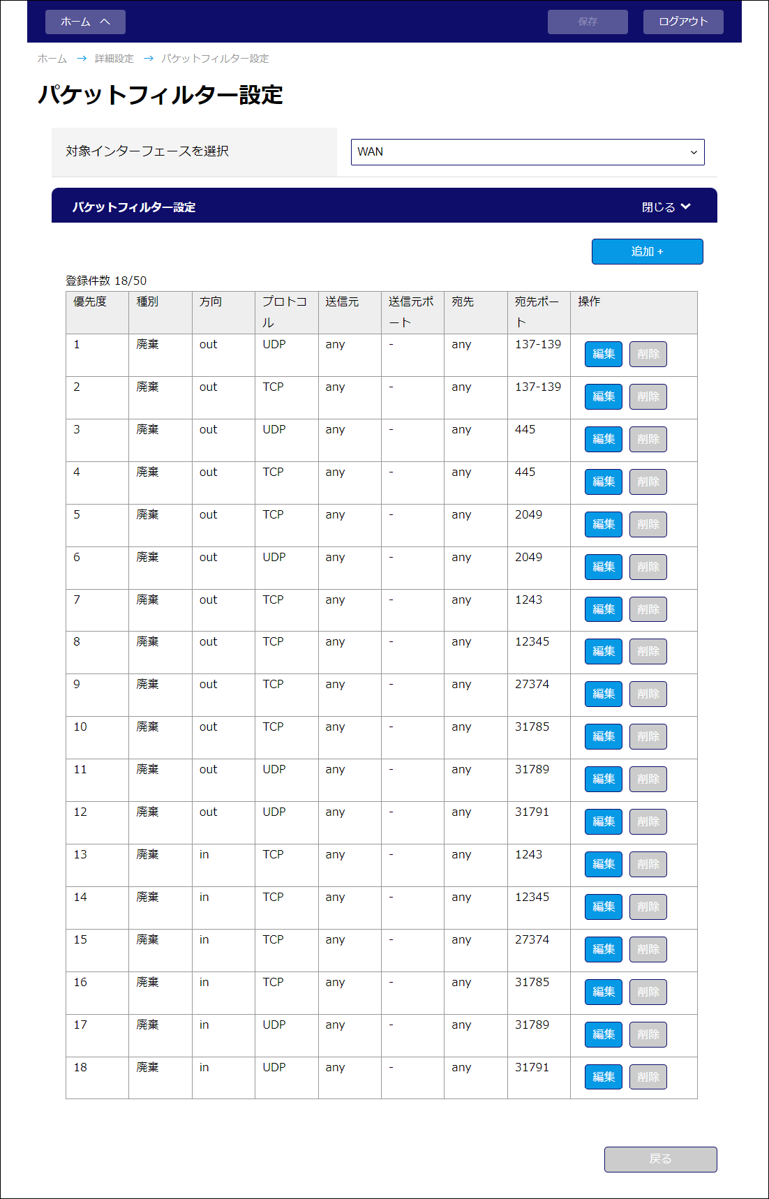 登録済みの設定を編集するには、編集したいパケットフィルター設定エントリの「編集」をクリックしてください。