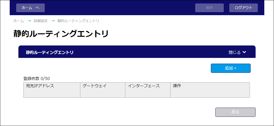 静的ルーティング設定(静的ルーティングエントリ)の一覧が表示されます。