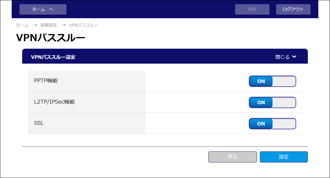 L2TP/IPsec方式によるVPN通信に対して、パススルー機能をONにします。