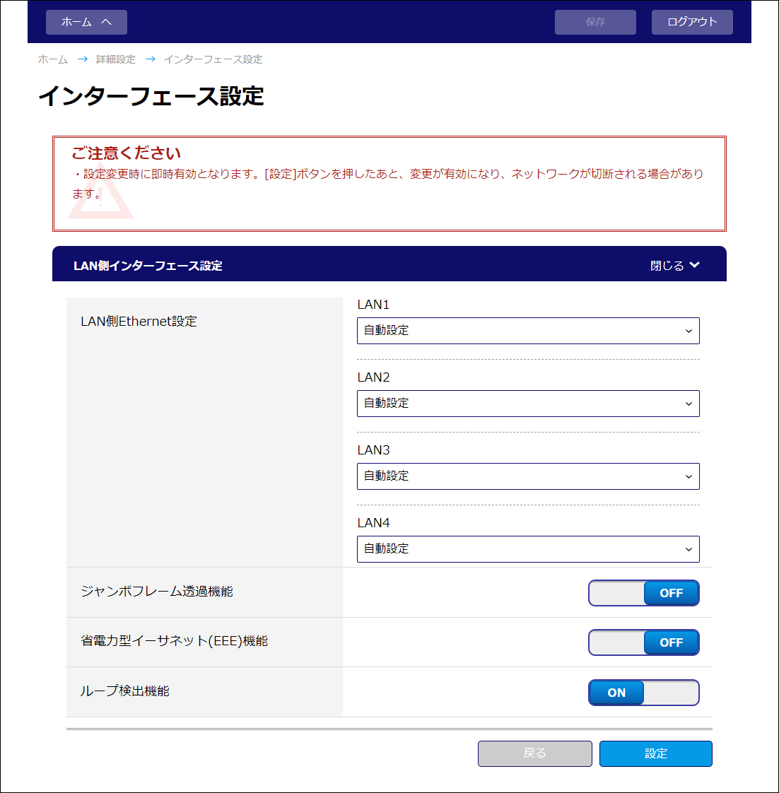 「LAN側設定」欄の「インターフェース設定」をクリックする