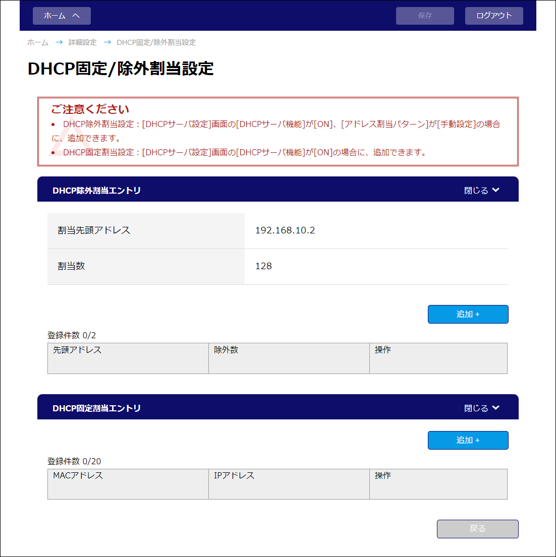 「DHCP固定割当エントリ」/「DHCP除外割当エントリ」欄の「追加 +」をクリックする