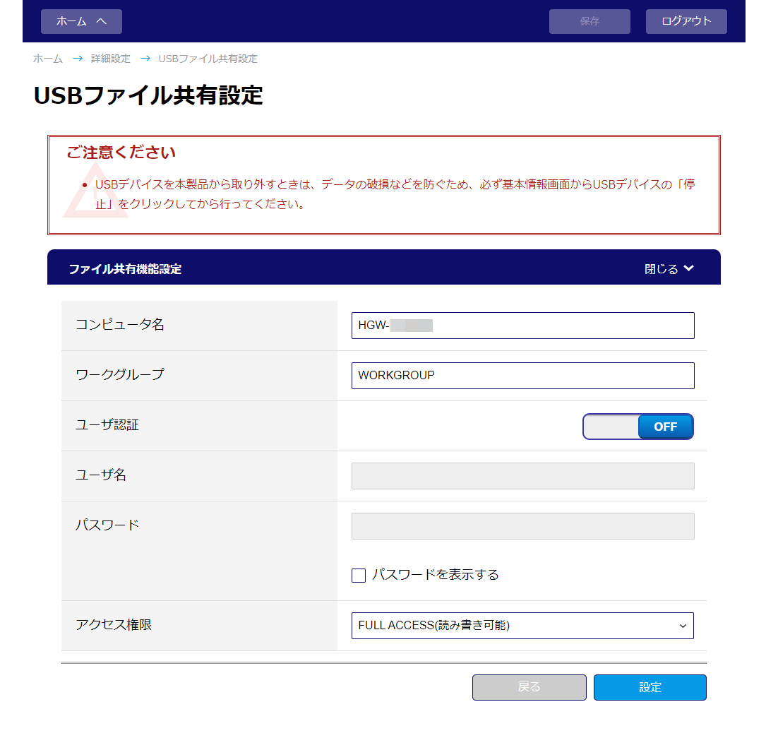 パソコンから本製品のUSBポートに取り付けたUSBデバイス(USBフラッシュメモリーや外付けHDDなど)内のファイルへアクセスする際のアクセス制限に関する設定を行います。