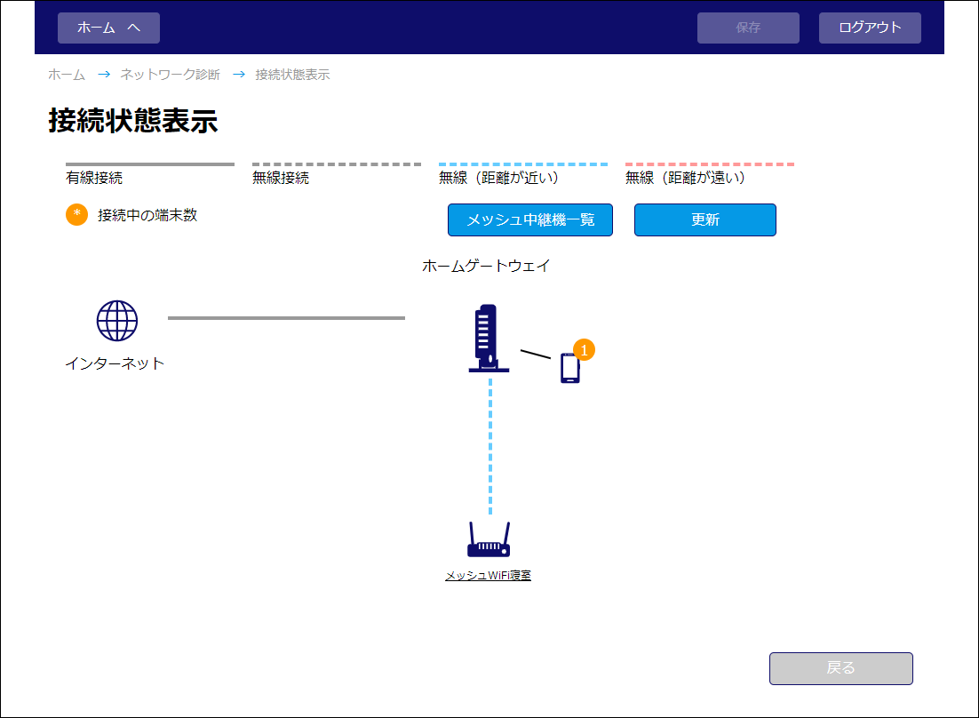 本製品とメッシュ中継機、およびパソコンやスマートフォンなど、ネットワーク全体の接続状態が表示されます。
