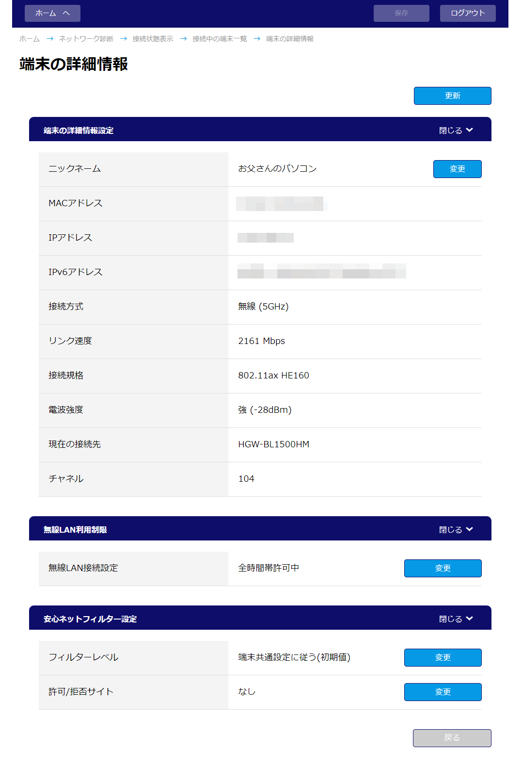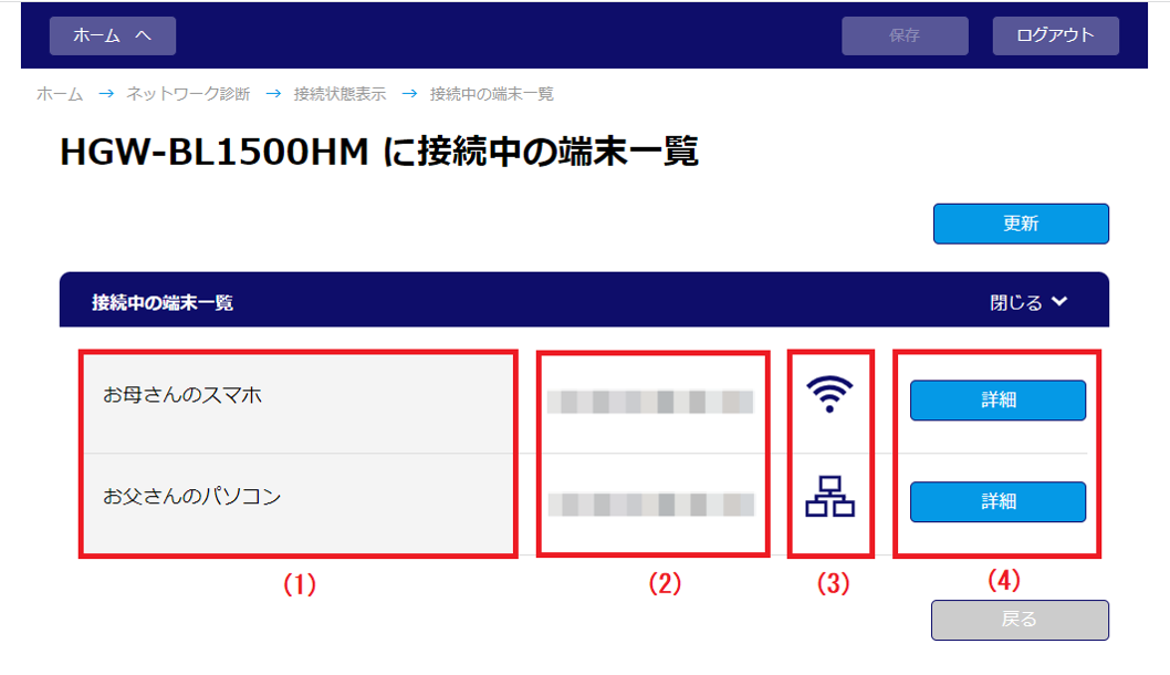 「接続中の端末一覧」から、詳細情報を表示したい端末の「詳細」をクリックする