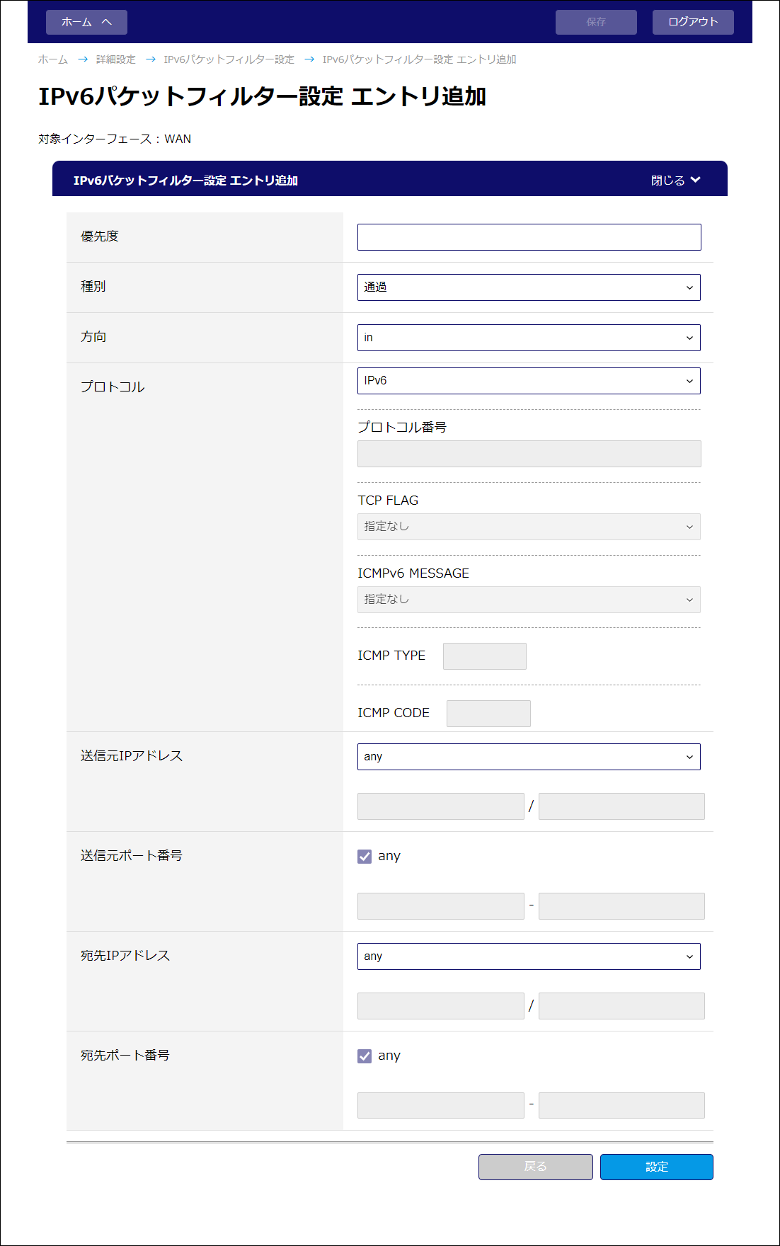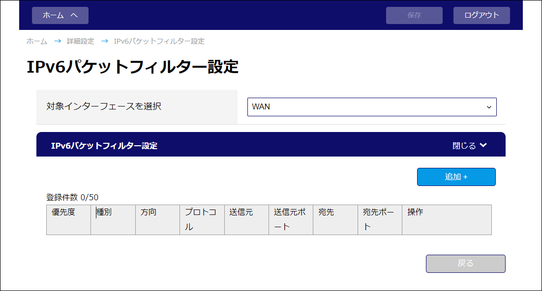 特定の条件を満たすIPv6パケットの通過や廃棄を設定できます。WAN側とLAN側で、それぞれ最大50個まで登録できます。