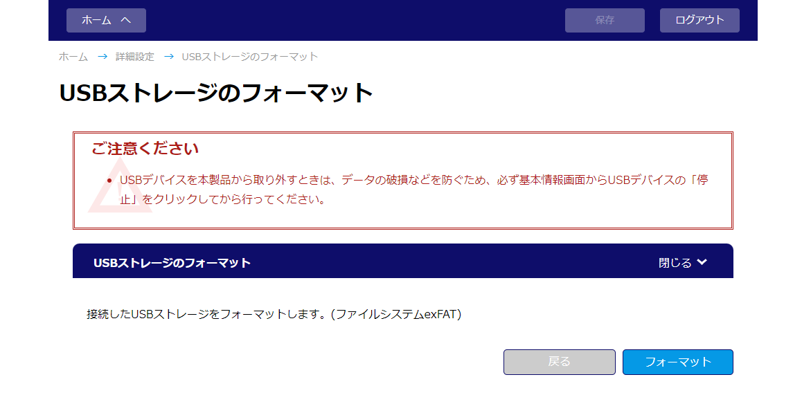 「LAN側設定」欄の「USBストレージのフォーマット」をクリックする
