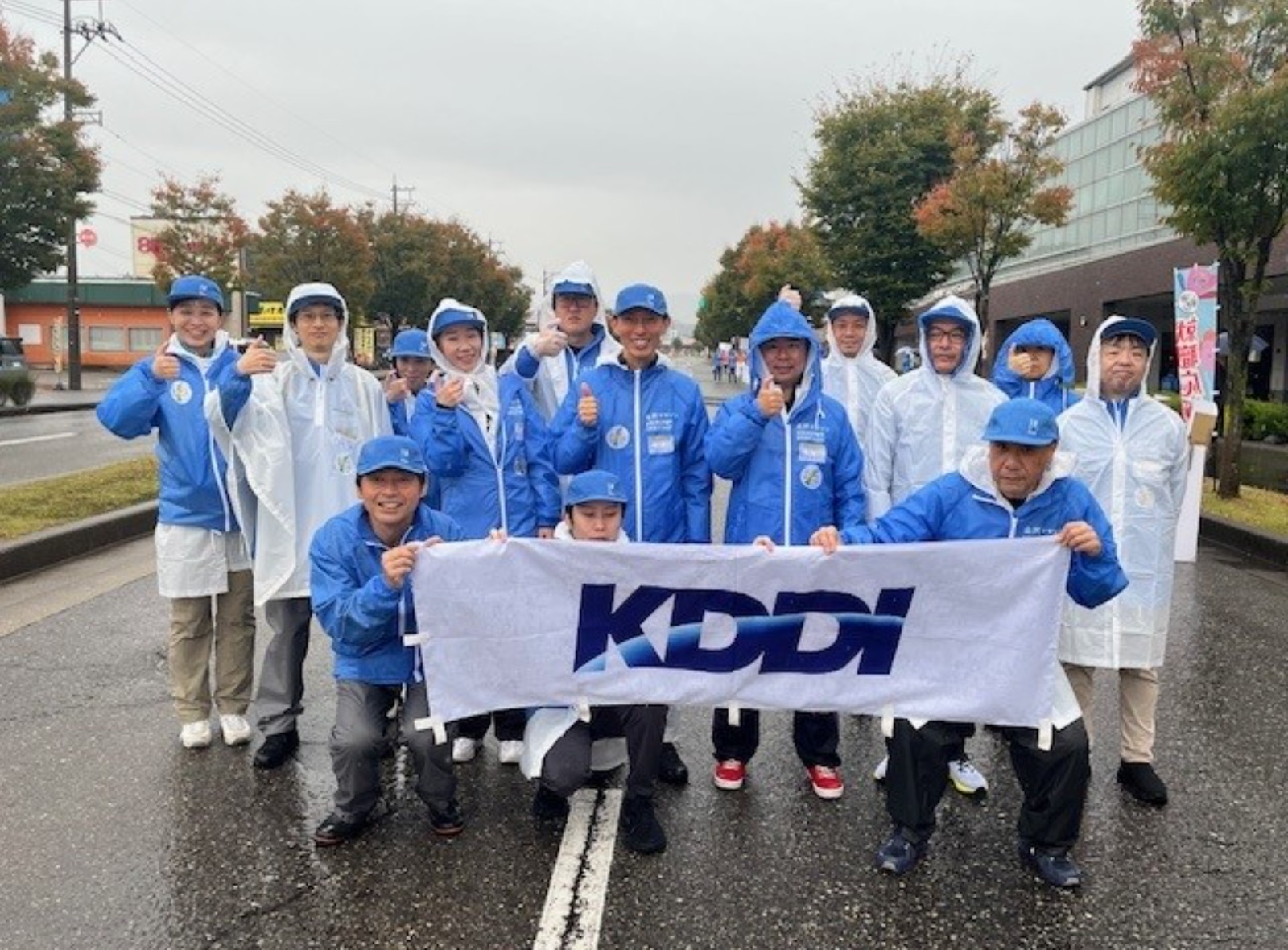 あいにくの雨天でしたので、ボランティア参加者全員がカッパを着用し、雨に濡れながらの給水活動となりました。 - 11:12 最後尾のランナーが通過したのちに交通規制が解除され、片付けを行って12時頃に解散しました。